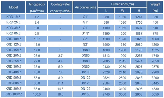 ADEKOM : KRD- MZ Series Combination Air dryer Refrigerated – Desiccant Combination Air Dryer In order to meet the very demanding air dryness requirement, ADEKOM has developed a series of Refrigerated – Desiccant Combination Air Dryer, the benefit of purge air loss and low power consumption from refrigerated air dryer and the benefit of low pressure dew point from desiccant air dryer are combined the super dry air with minimum energy consumption TECHNICAL DATA