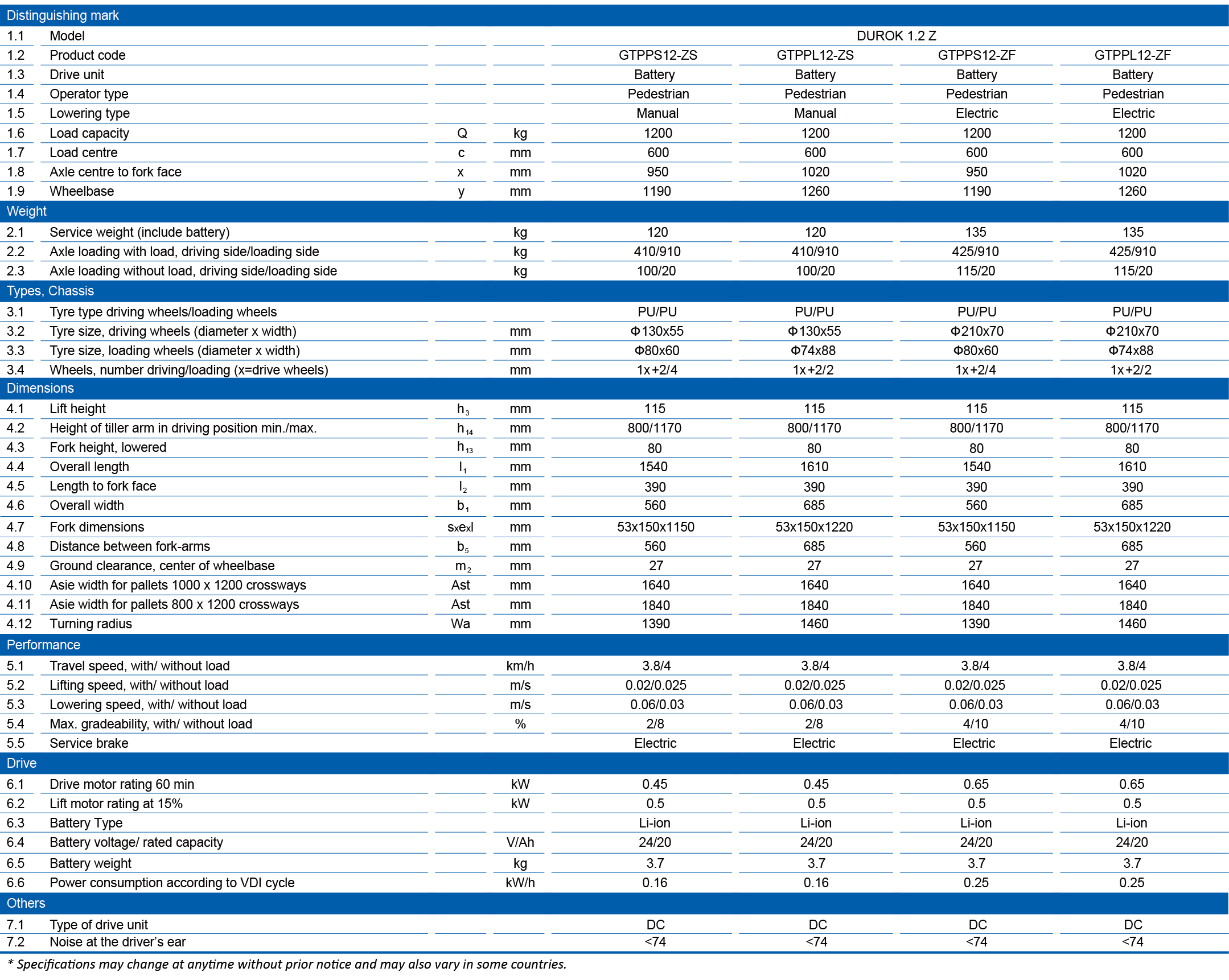 DUROK 1.2 Z Powered Pallet Trucks. Capacity 1,200 kg., Max. Lifting Height : 195 mm., Max. Lifting Height : 195 mm., Max. Travel speed : 3.8 - 4 km/h