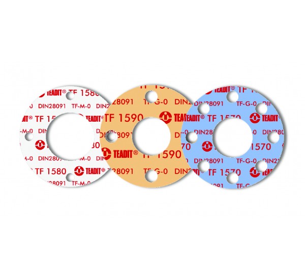 ปะเก็นพลาสติก PTFE (Polytetrafluoroethylene) สามารถทนความร้อนได้ที่ TEMP –240 ํC ถึง +260 ํC ใช้กันรั่วในของไหลที่มีลักษณะของกรดรุนแรง และเป็นพิษ เช่นทนสารเคมี ทนกรดได้ เป็น FOOD GRADE เหมาะจะใช้ใน อุตสาหกรรมพวกอาหารและยา ลักษณะเป็นสีขาว หักงอได้ บางตัวจะมีเนื้อนิ่ม
