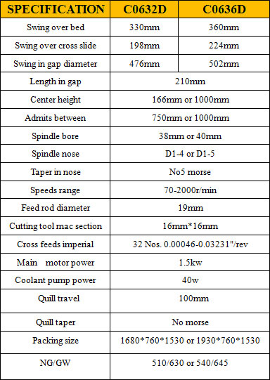 Bench Lathe Model C0632D , C0636DSPECIFICATIONSwing over bed , Swing over cross slide , Swing in gap diameter , Length in gap , Center height , Admits between , Spindle bore