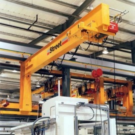 เครนติดผนังยื่นแขนหมุน (WALL JIB CRANES) เครนติดผนังยื่นแขนหมุน มีความเหมาะสมใช้สำหรับงานยกวัตถุงานหรือสินค้าเฉพาะพื้นที่ รอบวงรัศมีความยาวของวงแขนที่ยื่นหมุนของชุดเครน เช่นเดียวกันกับเครนตั้งเสายื..