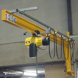Wall-mounted jib crane model PMS Lightweight, twist-free steel girder construction with low headroom. The boom is fitted with a bearing and a wall bracket for anchoring the crane to a concrete wall..